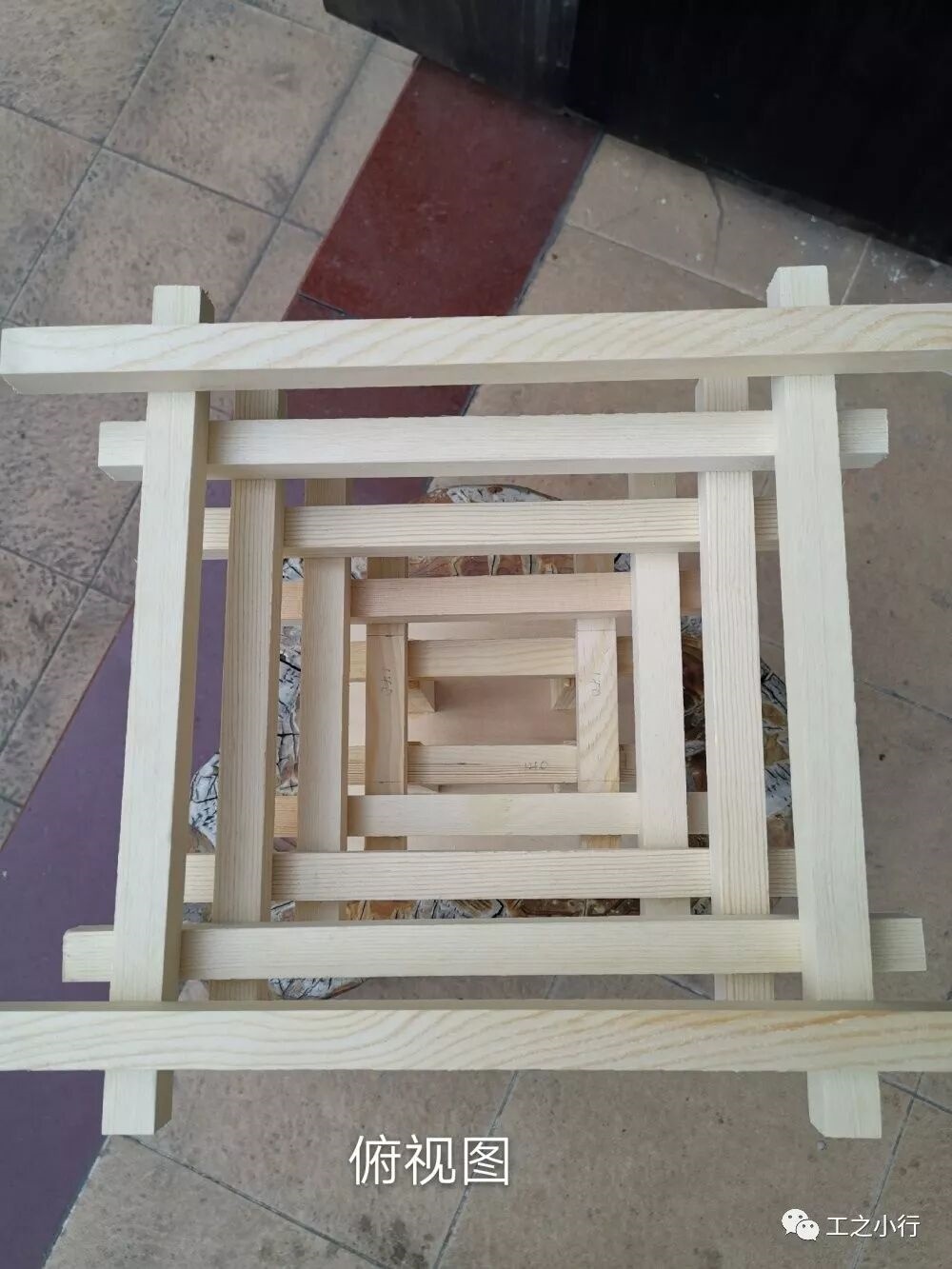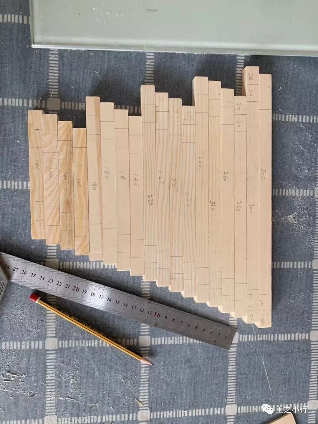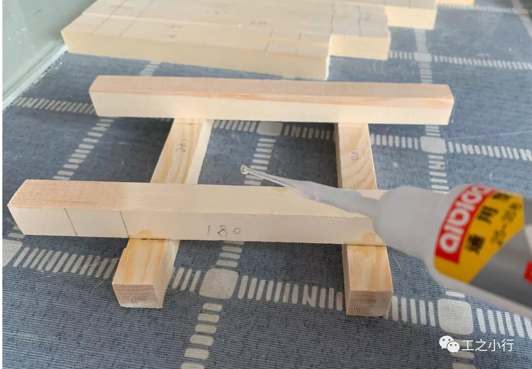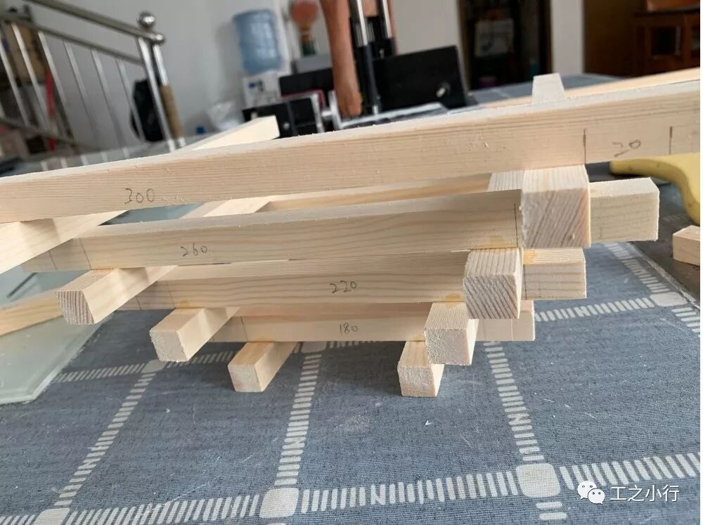 第一步要测量好每根木方的长度,每根木方要如图纸一样对称下来,这样做出来的才美观。300mm*2根、260mm*4根、220mm*4根、180mm*4根、140mm*4根、109mm*4根。
